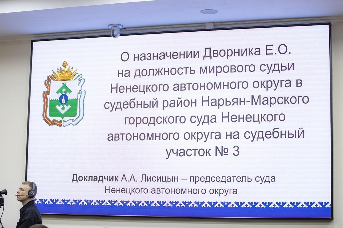 На сессии депутаты поддержали назначение Евгения Дворника на должность мирового судьи Нарьян-Марского городского суда НАО на судебный участок № 3. Также принято постановление о награждении 20 жителей округа Почетной грамотой Собрания депутатов НАО.